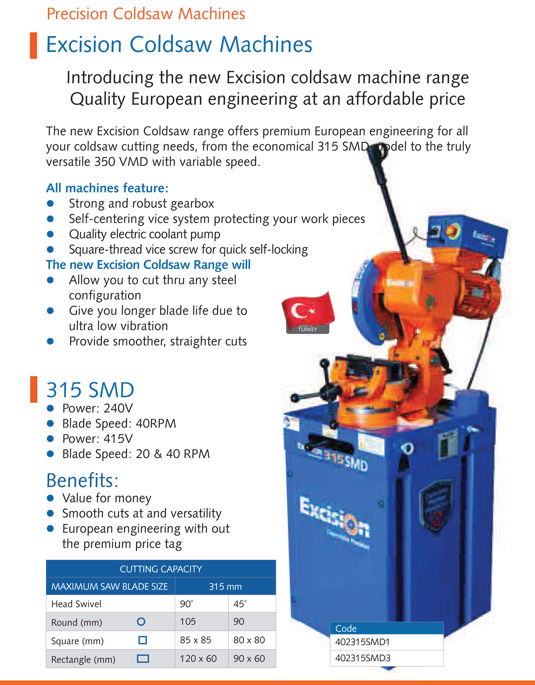 Quality Turkish made, Excision 315 SMD Coldsaws